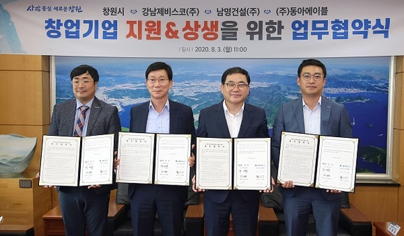 경남 창원시는 강남제비스코(주), 남명건설(주), ㈜동아에이블과 '창업기업 지원과 상생발전을 위한 업무협약'을 체결했다고 3일 밝혔다.