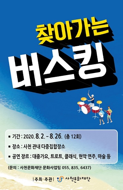앞서 '찾아가는 버스킹' 공연팀 선정은 사천 지역에 거주하는 공연인에 한해 공개모집을 통해 진행된다. 아울러 코로나19 예방을 위해 공연 장소 부근으로 방역활동을 할 계획이며, 마스크 착용 의무화, 관람 거리 준수하기, 손소독제 비치 등 코로나19 생활 속 거리두기 지침을 준수하면서 공연을 진행할 예정이다.