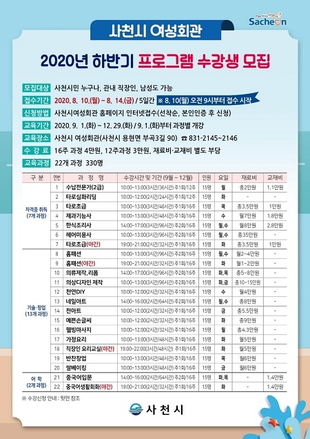사천시민 누구나 신청 가능하며, 8월 10일 오전 9시부터 사천시 여성회관 홈페이지를 통해 인터넷으로 수강 신청가능하다.