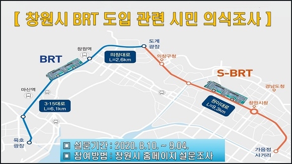 경남 창원시가 10일부터 9월 4일까지 총 4주간 신교통수단인 간선급행버스체계(이하 BRT) 도입에 따른 시민 의식조사를 실시한다.