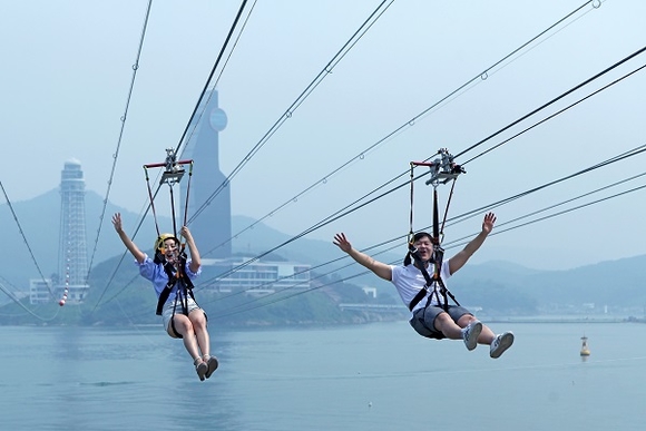 지난해 10월 개장한 창원짚트랙은 로프에 매달린 채 진해해양공원이 있는 음지도에서 건너편 소쿠리섬까지 1.4km에 달하는 거리를 최고 시속 80km로 활강하는 이색스포츠다. 체험 후 출발지까지 제트보트를 타고 돌아오는 것이 특징이다. 높이 94m 지점의 외벽을 걸으면서 짜릿함을 맛보는 엣지워크도 인기다.