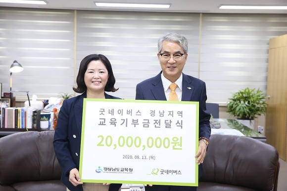 굿네이버스가 희망 나눔 모금액 2천만 원을 경남도교육청에 기탁했다. 모금액은 13일 오후 굿네이버스 권민정 부산울산경남본부장이 도교육청을 방문해 박종훈 교육감에게 전달했다.