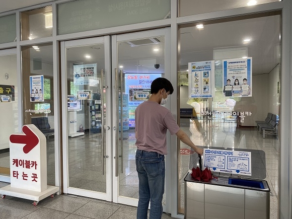 사천시시설관리공단은 일회용 우산 비닐씌우개 사용을 줄이기 위해 '친환경 우산 빗물제거기'를 사천바다케이블카, 사천시실내수영장, 하수도사업소 등에 설치했다고 14일 밝혔다.