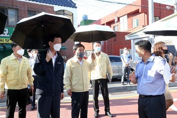 허성곤 김해시장은 지난 19일 폭염대비 현장점검에 나선 진영 행정안전부 장관을 맞아 기후변화 취약성 개선사업을 실시한 장유 무계지구를 점검했다.