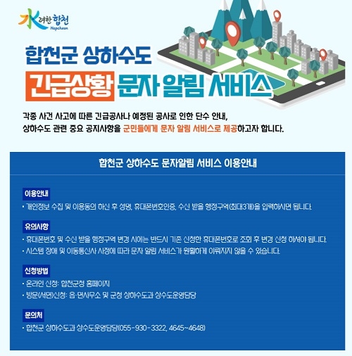 경남 합천군은 지난 26일부터 상하수도의 단수, 긴급복구, 긴급상황 등으로 인한 군민의 불편을 사전에 방지하고자 긴급상황 문자알림서비스를 시행하고 있다고 31일 밝혔다.
