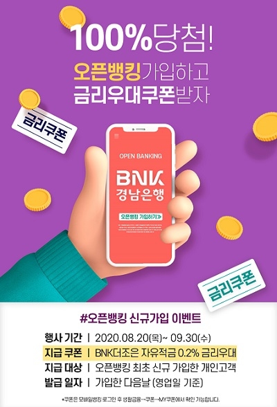 디지털전략부 관계자는 “BNK경남은행 오픈뱅킹서비스에 가입해 다른 은행 계좌 등록과 조회 그리고 이체 등 금융 업무를 편리하게 이용하고 금리우대쿠폰 혜택을 누리기를 바란다. 앞으로도 경남은행모바일뱅킹앱을 이용하는 고객들에게 더 많은 혜택을 드리기 위해 다양한 이벤트와 서비스를 선보이겠다”고 말했다.