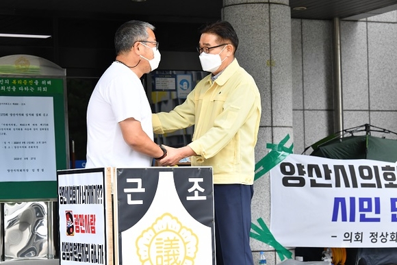 김일권 양산시장은 1일 양산시의회 정상화를 촉구하며 시의회 앞에서 1인시위와 단식농성을 이어가고 있는 시민 김천길 씨를 만나 건강악화에 대한 우려의 뜻을 전했다.