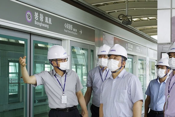 부산김해경전철(주) 김환국 대표이사를 비롯한 경영진은 1일 경전철 차량기지에서 제9호 태풍 '마이삭' 대비 안전대책회의를 열고 현장 안전점검을 실시했다.