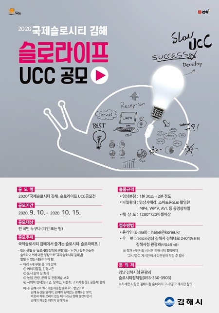경남 김해시가 대내외적으로 국제슬로시티 김해를 알리고 슬로라이프 운동 확산과 동참을 위해 10일부터 10월 15일까지 '국제슬로시티 김해' 슬로라이프 UCC 공모전'을 연다.
