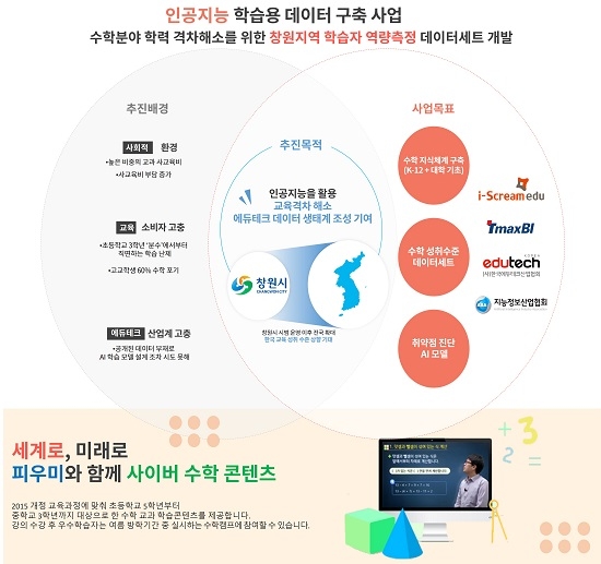 이번 공모 사업에서 시는 국내 최고의 온라인 학습분야 전문기업 및 기관인 경남대학교, ㈜아이스크림에듀, ㈜티맥스BI, 사)에듀테크산업협회, 사)지능정보산업협회와 컨소시엄을 구성하고, '수학분야 학력격차 해소를 위한 창원지역 학습자 역량측정 데이터 세트 구축' 사업을 제안해 선정됐으며, 사업비 23억원을 전액 국비로 지원받는다.