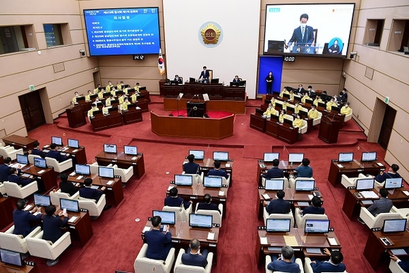 김하용 의장은 개회사를 통해서 “코로나 지역 확산을 현재 단계에서 막아내지 못한다면, 사회적 거리두기 3단계로 격상될 수도 있는 엄중한 상황이다. 특히 얼마남지 않은 한가위 연휴 동안에는 방역수칙을 더욱 철저히 준수해 주시기를 부탁드린다”며 “집행부에서도 내년도 예산 편성에 있어, 힘든 나날을 보내고 있는 소상공인과 중소기업에 실질적인 도움이 되는 시책을 마련해 줄 것을 당부드린다”고 말했다.