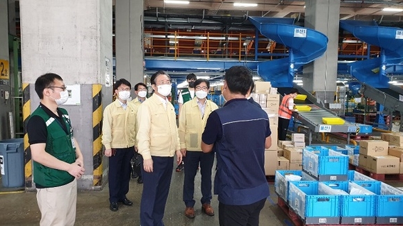 박종원 경남도 경제부지사가 성윤모 산업통상자원부 장관과 함께 추석연휴 온라인 주문·배송 급증에 대비한 온라인 유통업계의 코로나19 방역 현장대응 상황을 점검했다.