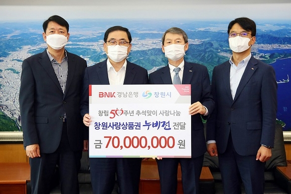 BNK경남은행은 21일 민족 최대 명절 추석을 맞아 창원시에 '창원사랑상품권(누비전)'을 기탁했다.