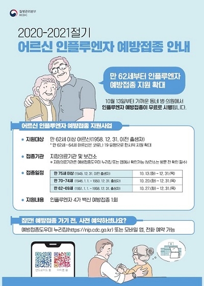 어른신은 ▲만 75세 이상은 10월 13일부터 ▲만 70~74세는 10월 20일부터 ▲만 62~69세는 10월 27일부터 시작해 올해 말까지 접종받을 수 있다.