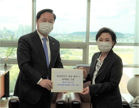 국회 기획재정위원회 소속 더불어민주당 김두관 의원(양산시을)이 24일 국회의원회관 사무실에서 김현미 국토교통부 장관을 만나 '동남권(부산~웅상~울산) 광역철도 건설사업'을 정부가 주도하는 제4차 대도시권 광역교통시행계획에 반영해 줄 것을 강력히 요청했다.