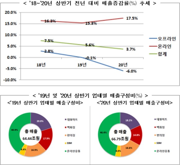 이처럼 주요 식품업체들이 추석을 앞두고 온라인 마케팅·배송서비스에 집중하는 이유는 코로나19 재확산세로 오프라인 매장을 방문하는 이들이 예년에 비해 크게 줄었기 때문이다. 실제로 산업통상자원부가 최근 발표한 올 상반기 유통업체 동향에 따르면, 대형마트와 백화점의 매출은 각각 5.6%와 14.2%로 감소했다.