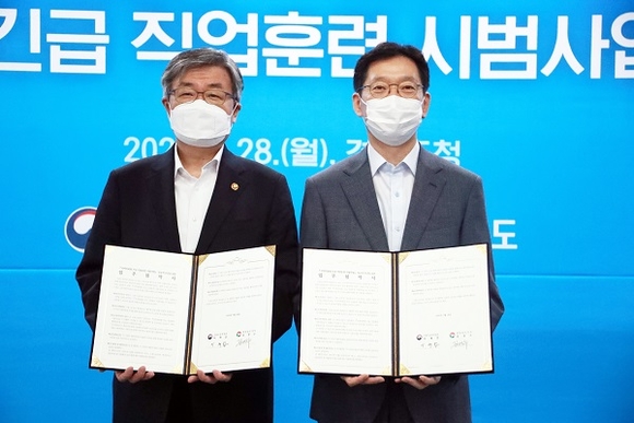 경남도와 고용노동부가 28일 도청에서 전국 최초로 '지역특화형 긴급 직업훈련 시범사업' 추진을 위한 업무협약을 체결하고, 경남 주력산업의 좋은 일자리를 지키기 위해 본격적으로 힘을 모아 나가기로 했다.