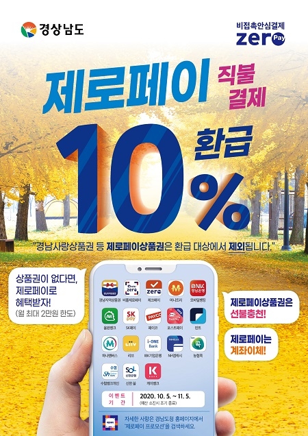 경남도가 코로나19 장기화로 어려움을 겪고 있는 소상공인과 자영업자의 경영부담을 줄이고 지역상권에 활력을 불어넣기 위해 5일부터 '제로페이 직불결제 환급 이벤트'를 진행한다.