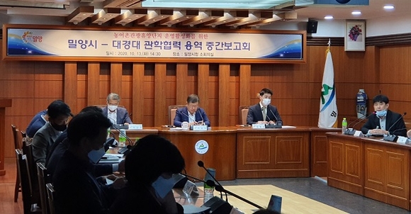 경남 밀양시는 13일 시청 소회의실에서 농어촌관광휴양단지 운영 활성화를 위한 '밀양시-대경대학교 관학협력 과제발굴' 연구용역 중간보고회를 가졌다.