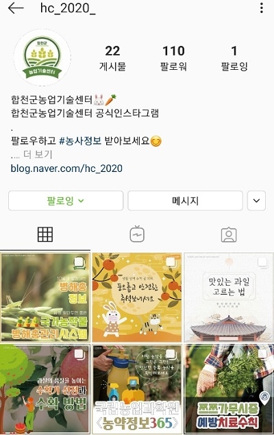 블로그나 인스타그램 회원가입 후 사용자 검색창에서 '합천군농업기술센터'로 검색해 팔로우 또는 이웃신청하면 누구나 영농정보를 제공받을 수 있다.