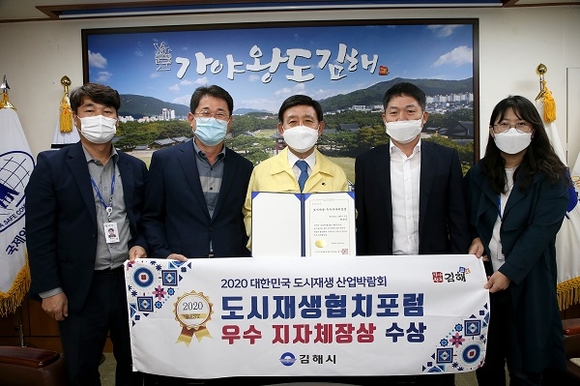 허성곤 김해시장이 14~16일 서울 SETEC에서 열린 '2020 대한민국 도시재생 산업박람회' 제7차 도시재생 광역협치포럼에서 우수 지자체장상을 수상했다.