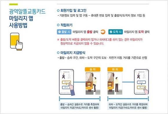 카드발급과 이용에 관한 정보는 광역알뜰교통카드 누리집에서 확인 가능하며, 발급받은 교통카드는 반드시 마일리지 앱과 함께 사용해야 한다.