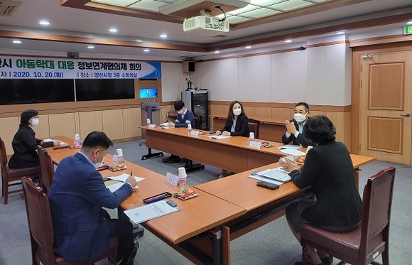 경남 양산시는 아동학대 대응을 위해 관련 기관들과 정보를 공유하고 유대체계를 강화하는 양산시 아동학대 대응 정보연계협의체를 구성하고 지난 20일 시청 소회의실에서 첫 회의를 진행했다.