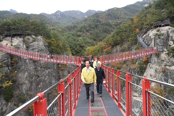 이번 점검은 구인모 군수, 경제산업국장, 산림과 직원 등 10여 명이 참석했으며, 출렁다리 개통식 준비사항과 함께 개통 이후 관광객 폭증에 대비한 현장의 불편사항을 보완 개선하기 위해 이뤄졌다.