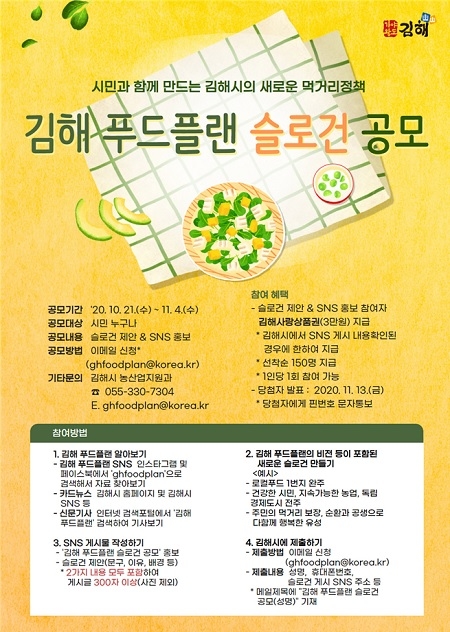 경남 김해시는 오는 11월 4일까지 새로운 먹거리정책인 '김해 푸드플랜'의 슬로건을 시민 공모한다고 26일 밝혔다.