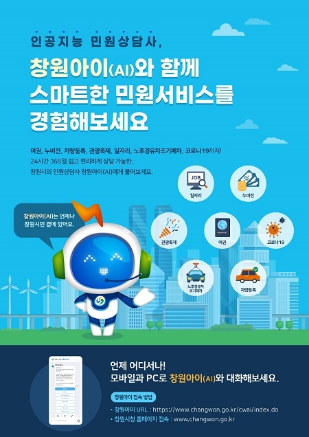 오는 11월 2일부터 정식 서비스되는 챗봇 서비스 '창원아이(AI)'는 컴퓨터나 핸드폰으로 창원시 홈페이지 접속 또는 포털사이트 검색창에 '창원시 챗봇'으로 검색이 가능하며, 접속 후 메신저에서 채팅하듯이 질문하면 챗봇이 학습된 지식정보를 활용하여 응답한다.