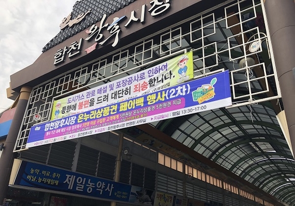 경남 합천군이 오는 15일까지 합천왕후시장, 묘산시장, 초계시장, 삼가시장 등 4개 전통시장에서 코로나19로 침체된 전통시장의 상권 활성화를 위해 '온누리상품권 페이백(2차) 행사'를 실시한다.