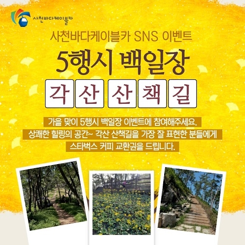 먼저 3일부터 7일까지 '오행시 백일장–각산 산책길' 이벤트를 실시한다. 참여방법은 페이스북 또는 인스타그램 공식 계정을 팔로워한 뒤 이벤트 게시물에 각산 산책길의 특징을 잘 표현한 오행시를 댓글로 남기면 된다. 댓글 내용과 기타 준수사항을 평가한 후 당첨자 20명에게 스타벅스 커피 교환권을 증정한다.