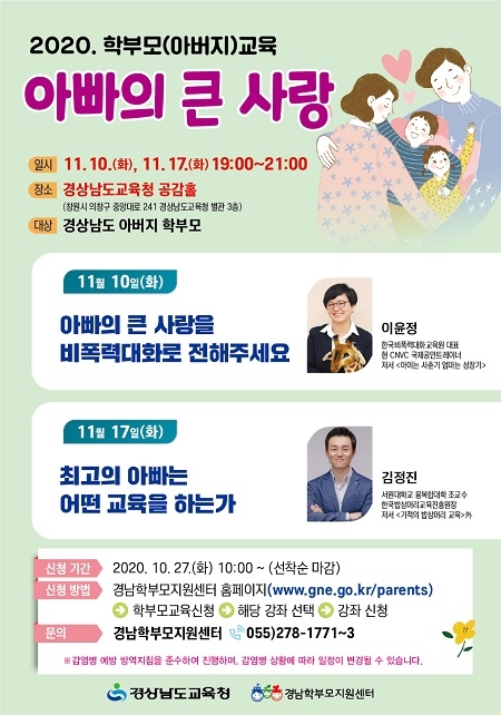 경남도교육청이 오는 10일과 17일 도교육청 공감홀에서 2020 학부모교육 '아빠의 큰 사랑'을 개강한다.