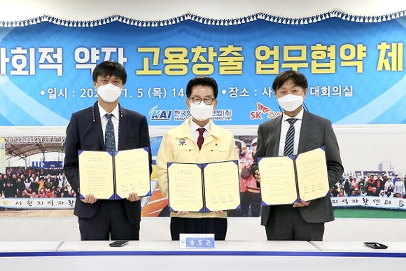 경남 사천시와 한국항공우주산업(KAI), SK C&C는 5일 시청 대회의실에서 '사회적 약자 고용창출'에 대한 업무협약을 체결했다.