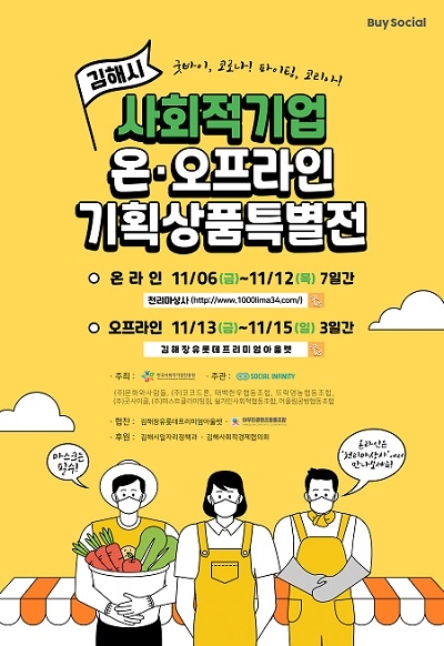 온라인 기획상품특별전은 6일부터 12일까지 김해시 소재 온라인 종합쇼핑몰인 천리마상사 홈페이지에서 개최되며, 관내 사회적기업 제품을 10~20% 할인된 금액으로 구매할 수 있게 된다.