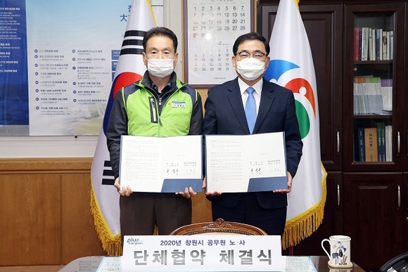 경남 창원시와 창원시공무원노동조합은 지난 6일 시청 집무실에서 허성무 시장, 신현승 노동조합위원장, 노사양측 교섭위원이 참석한 가운데 2020년 노사 단체협약을 체결했다.