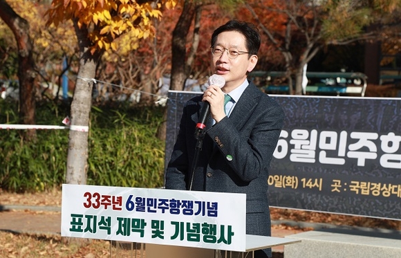 김 지사는 10일 오후 경상대학교 가좌캠퍼스 민주광장에서 열린 '제33주년 6월민주항쟁기념 표지석 제막식'에 참석해 “지금 이 시대의 민주주의 정신은 '생활 속 민주주의', '경제민주주의'를 실천하는 길이고, 지역격차와 소득격차를 해소해나가는 것이 지금의 6월항쟁 정신이자 민주주의 시대 정신”이라며 이같이 말했다.