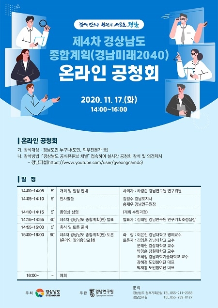 도 공식 소통누리망(유튜브채널) '갱남피셜'을 통해 진행하는 이번 온라인 공청회는 당초 도민과 함께 만드는 경남미래 20년의 종합계획을 수립하기 위해 권역별로 나눠 현장 공청회로 진행하려고 했으나, 코로나19가 장기화되면서 감염확산 방지를 위해 비대면으로 진행하게 됐다.