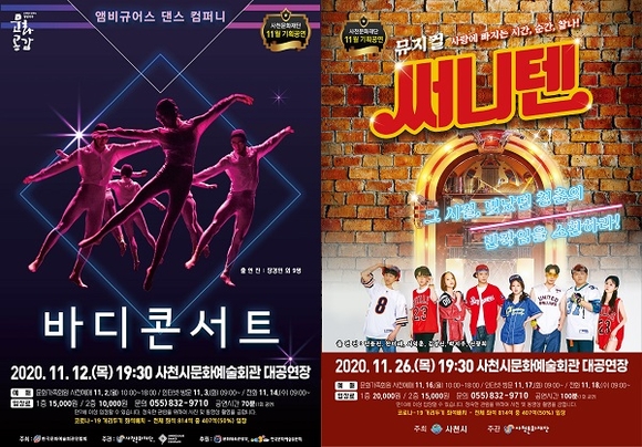 경남 사천시는 코로나19 확진자가 증가함에 따라 12일 저녁 7시30분 사천시문화예술회관 대공연장에서 예정되었던 <바디 콘서트>와 26일 저녁 7시30분 예정된 뮤지컬 <써니텐> 공연이 비대면 방식으로 유튜브에서 실황 중계된다고 밝혔다.