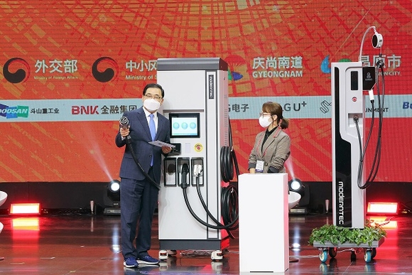 전기자동차 충전기를 생산하는 모던텍에서는 전치가 충전 인프라를 구축하는데 큰 힘이 되는 업체로 분리형 충전기 및 로봇충전 시스템에 대해 적극 홍보했다.
