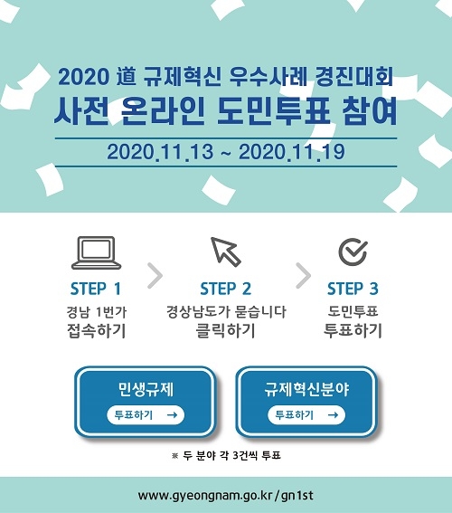 7일간 진행되는 온라인 투표는 도민이면 누구나 참여할 수 있으며, 규제 혁신이 잘 된 우수사례 16건에 대해 민생규제분야(7건), 규제혁신분야(9건)에 각각 3건씩 투표하면 된다.