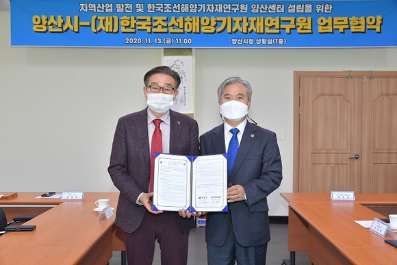 경남 양산시는 13일 오전 시장집무실에서 내년 9월 준공예정인 양산산단 혁신지원센터에 '한국조선해양기자재연구원(KOMERI) 양산센터'를 설립하기로 하고 업무협약을 체결했다.