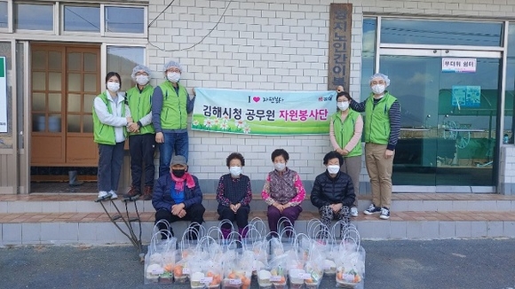 김해시청 공무원 자원봉사단은 지난 14일 생림면 생철권역 무척사랑센터에서 밑반찬을 만들어 독거노인 등 취약계층에게 배달하는 봉사활동을 펼쳤다.