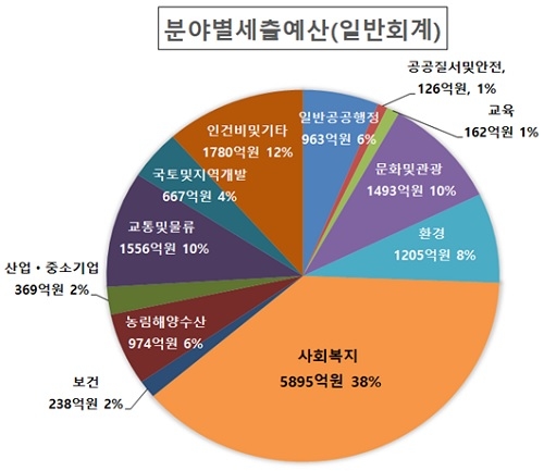 내년도 분야별 일반회계 세출예산 편성현황을 살펴보면 ▲사회복지 5895억원(38%) ▲교통 및 물류 1556억원(10%) ▲문화 및 관광 1493억원(10%) ▲환경 1205억원(8%) ▲농림해양수산 974억원(6%) ▲일반공공행정 963억원(6%) ▲국토 및 지역개발 667억원(4%) ▲산업 및 중소기업 369억원 (2%) ▲보건 238억원 (2%)▲교육 162억원 (1%), ▲공공질서 및 안전 126억원 (1%) 순이다.