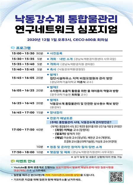 낙동강유역환경청과 영남권 4개(경남‧대구‧부산‧울산) 녹색환경지원센터는 1일 오후 지역 내 학계, 전문가를 대상으로 '낙동강수계 통합물관리 연구네트워크 심포지엄'을 코로나19 확산세를 감안, 온라인을 통한 비대면 방식으로 개최한다.