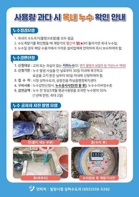 경남 밀양시는 상수도 수용가에게 옥내 누수 확인․조치 방법과 하수도 역류 예방 방법을 안내해 민원불편을 최소화하고자 홍보물을 제작해 배포한다고 2일 밝혔다.