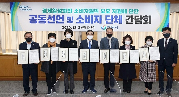 경남 창원시는 3일 오전 시정회의실에서 '제25회 소비자의 날'을 맞아 소비자단체들과 함께 경제활성화 및 소비자권익보호 지원을 위한 공동선언을 했다. 코로나19로 인한 경제 침체의 회복과 소비자 피해 구제, 소상공인의 보호, 소비자권익 증진을 위해서다.