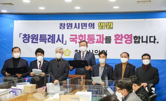 창원시의회는 10일 시청 프레스센터에서 지방자치법 전부개정안이 정기국회를 통과하고 창원특례시가 확정된 것에 대해 환영문을 발표했다.