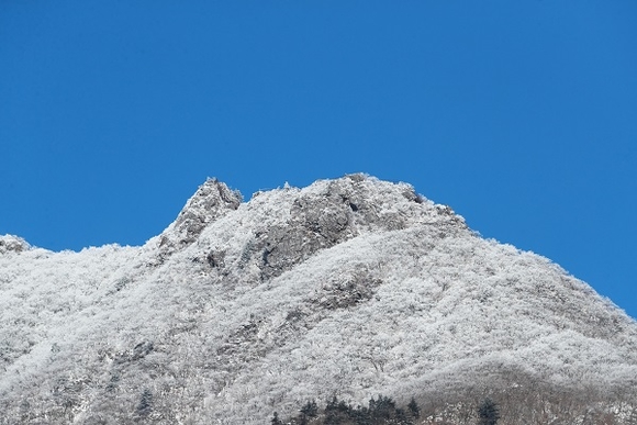 15일 경남 함양군 서상면 경남덕유학생교육원에서 바라 본 남덕유산이 파란하늘과 하얀 눈이 어우러져 아름다움을 연출하고 있다. (사진=함양군 제공)