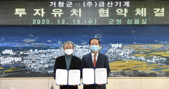 이날 투자협약은 코로나19 확산에 따라 구인모 거창군수와 조수현 금산기계 대표 등 회사 관계자 최소 인원이 참석한 가운데 열렸다.